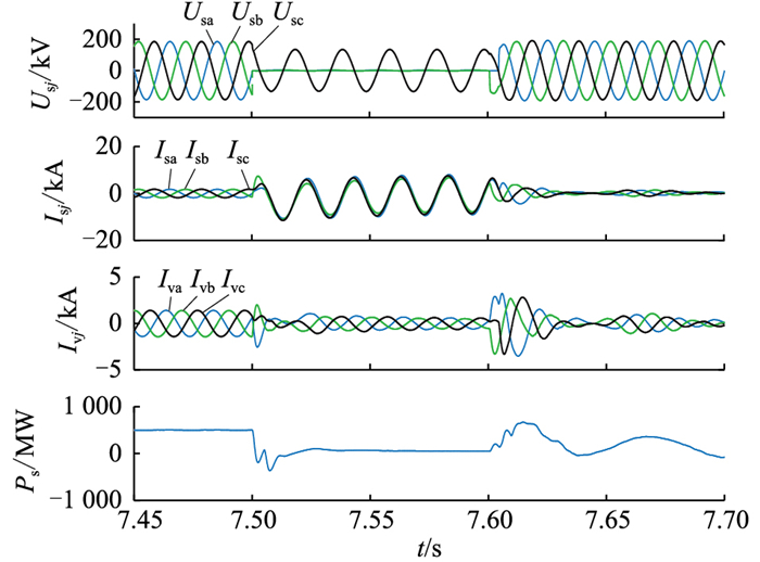 仿真工况1为模拟整流侧网侧电压单相接地故障100 ms,仿真结果见图 10。仿真工况2为模拟整流侧网侧电压a、b两相接地故障100 ms,仿真结果见图 11,其中Ps为柔直系统传输的功率。