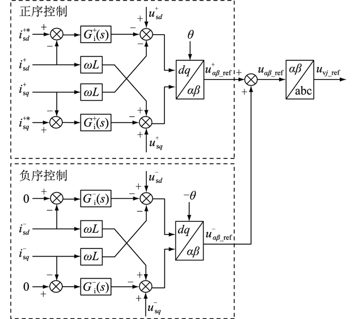 2.1 柔直系统高频阻抗柔直系统与交流电网的高频谐振在工程中屡见不鲜[19, 22]。对现有基于正负序分解的控制系统进行高频建模,分析其阻抗特性后,根据图 3对柔直系统进行高频阻抗建模。由于正负序的对称性,其在dq坐标系下的控制框图是一致的,如图 5所示。