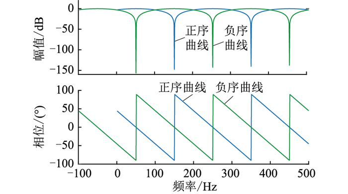 图 4 正负序分解函数的幅频特性曲线 Fig. 4 Amplitude-frequency characteristic curves of posi- tive and negative sequence decomposition function |