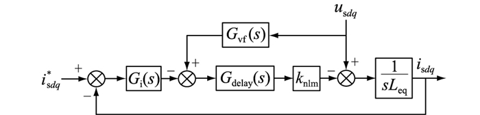 图 5中,isdq*为电流内环参考值的dq分量;isdq为网侧电流实际值的dq分量;Gvf(s)为前馈电压滤波器,可采用一阶低通、二阶低通或者非线性滤波器;knlm为调制系数,一般为1;Gdelay(s)为考虑控制系统延时的传递函数,表达式为: