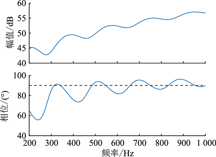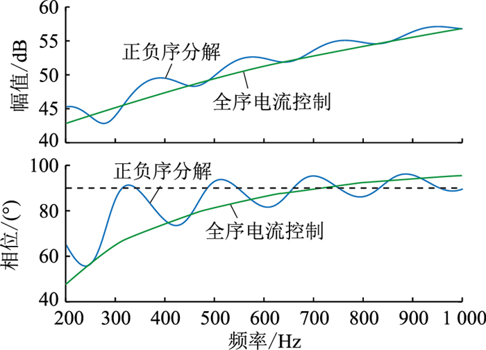理论上首次出现负阻的频率应为714 Hz,而从图 6中可以看到,在320 Hz时阻抗相位大于90°,已经出现了负阻,且阻抗幅值、相位存在187 Hz左右的周期性波动。正负序分解的应用,使柔直系统出现负阻的频率提前,且柔直阻抗存在周期性更短的、超过90°的相位波动,从而柔直系统与交流电网在该点处有产生谐振的风险。