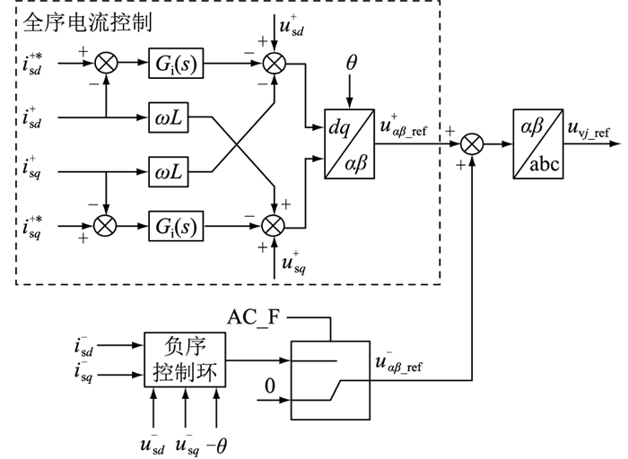 2.2 适时切换的故障穿越控制方法设计为实现柔直的故障穿越、控制负序电流,需要采用正负序控制,而正负序分解又导致柔直阻抗产生周期性波动,影响稳定性。因此文中采用一种适时切换的故障穿越方法,在稳态时采用全序电流环控制,故障时快速检测判断出故障,并叠加负序电流环控制,实现故障穿越。具体控制框图见图 7。
