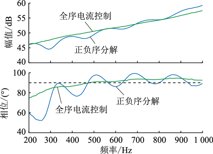 首先对不同算法下的柔直系统进行高频处的阻抗扫描,在整流侧注入谐波电压,通过检测系统谐波电压和电流计算柔直系统阻抗,得到正负序控制和全序控制下的柔直系统阻抗,如图 9所示。从图 9可以看出,内环采用全序电流控制算法后,稳态时的阻抗特性曲线幅值、相位平滑,未有周期性的波动,大大降低了高频振荡的风险。