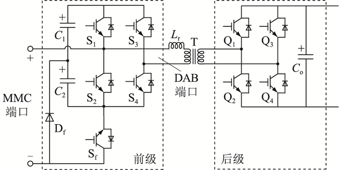 1 CSPI型MMC-SST拓扑文献[33]给出了传统DAB型MMC-SST的通用拓扑,文中所提CSPI型MMC-SST对上述拓扑中的SM-DAB模块进行改进,CSPI拓扑如图 1所示。在CSPI中,高频变压器T左侧为前级电路,右侧为后级电路,CSPI型MMC-SST由多个CSPI前级串联后级并联组成。在前级电路中,开关管S1和S2串联构成开关对1,开关管S3和S4串联构成开关对2,电容C1和C2串联构成电容桥臂。在此基础上,保护开关管Sf串联在开关对1中且与S1、S2串联方向相反,保护二极管Df将Sf的下端点与电容桥臂的中点连接起来。后级电路与传统DAB型MMC-SST子模块的后级电路结构相同,由开关管Q1—Q4构成的H桥整流电路和一个输出并联电容Co组成。开关对1、电容桥臂、保护开关管Sf和保护二极管Df共同构成了MMC子模块中的二极管钳位子模块结构[34];开关对1、开关对2、电容桥臂、高频变压器、高频变压器的漏感Lr和后级电路共同构成了DAB结构。从开关对1的中点和Sf的下端点引出连接线构成MMC端口,从开关对1的中点和开关对2的中点引出连接线构成DAB端口。可见,文中所提CSPI型MMC-SST在DAB型MMC-SST的基础上复用了一对开关对,从而减少了开关器件。