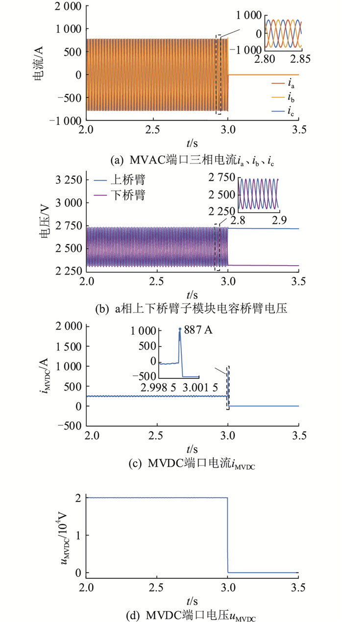 4.2 直流短路故障工况对文中所提CSPI型MMC-SST拓扑在MVDC侧发生直流短路故障下的工况进行验证。在2.99 s时,MVDC端口发生短路故障,短路阻抗为0.1 Ω,系统在3 s时检测到故障,并切换到故障运行工况,直流短路故障工况下的仿真结果如图 10所示。图 10(a)—图 10(d)分别为发生直流短路故障后MVAC端口三相电流波形、a相上下桥臂子模块电容桥臂电压波形、MVDC端口电流波形以及MVDC端口电压波形。