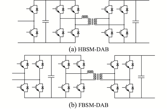 模块化多电平换流器(modular multi-level converter, MMC)能够通过电压源变换器的共模、差模连接方式构造出中压直流端口,已被用于构造面向交直流混合配电网应用的MMC-SST输入级。根据MMC-SST中间级双向有源全桥(dual active bridge, DAB)变换器连接方式的不同,主要有2种代表性拓扑。一是输入串联输出并联(input series output parallel, ISOP)型MMC-SST,即将DAB构造成ISOP结构作为SST的中间级与输入级MMC的中压直流(medium voltage direct current,MVDC)端口相连[13-17];二是DAB型MMC-SST,即在输入级MMC的每一个子模块后接入一个DAB[18-23],形成子模块(submodule,SM)-DAB模块。在ISOP型MMC-SST中,使用到的DAB数量较少,SST具备较高的功率密度。DAB型MMC-SST拓扑具有控制灵活、易于实现冗余容错等优点,然而每个子模块的直流侧都需要连接DAB,故在中压配电网中使用时,需要大量的开关器件。并且传统半桥子模块(half bridge submodule, HBSM)结构的DAB型MMC-SST无法清除短路故障电流。