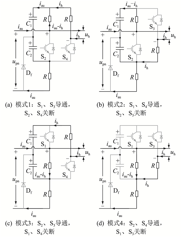 2 正常工况下CSPI型MMC-SST工作原理分析 2.1 CSPI工作模式分析由第1章拓扑分析可知,CSPI中MMC端口输出电压upn由开关器件S1、S2的导通状态决定,DAB端口电压uh由开关器件S1—S4的导通状态决定。在正常工况下,CSPI中开关器件Sf处于恒定导通状态,因此对于输入级MMC而言,由开关对1、电容桥臂以及Sf、Df组成的子模块相当于半桥结构,upn只有0和电容桥臂电压2种情况。在分析中,认为电容C1和C2上的电压均稳定在额定值Uc。正常工况下CSPI前级电路4种工作模式的等效电路如图 3所示。图 3中,R为开关器件的导通电阻;iau为模块MMC端口输入正向电流;ih为DAB端口输出电流。