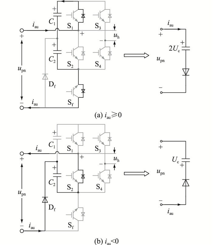 在检测到直流短路故障发生后,立即闭锁所有开关器件。直流短路故障时CSPI工作原理及闭锁等效电路如图 6所示。当桥臂电流iau≥0时,CSPI中的电容C1和电容C2相当于串联,桥臂电流给两电容充电,upn为2Uc,CSPI相当于一个电压大小为2Uc的子模块电容和二极管串联接在电路中。当桥臂电流iau < 0时,CSPI中只有电容C2接入回路中,upn为Uc,CSPI相当于一个电压大小为Uc的子模块电容和二极管串联接在电路中。