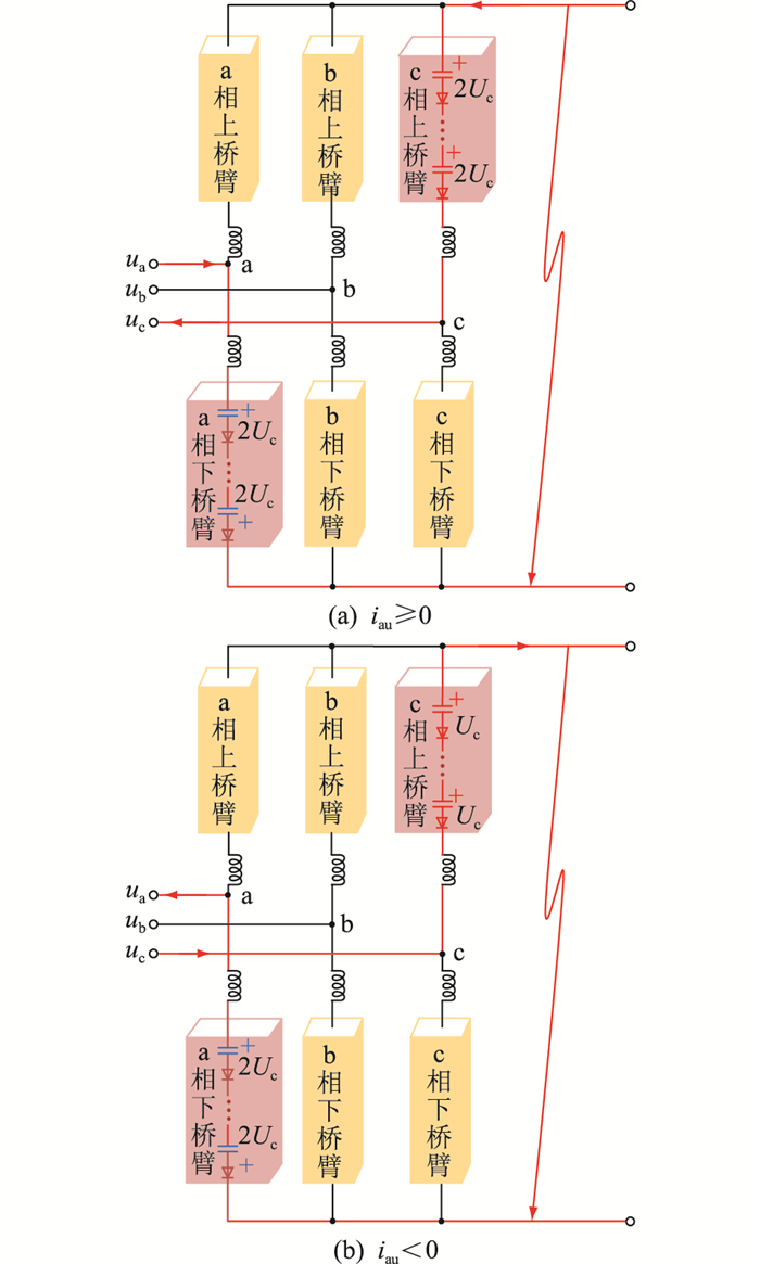 当桥臂电流iau≥0时,如图 7(a)所示,可以得到: