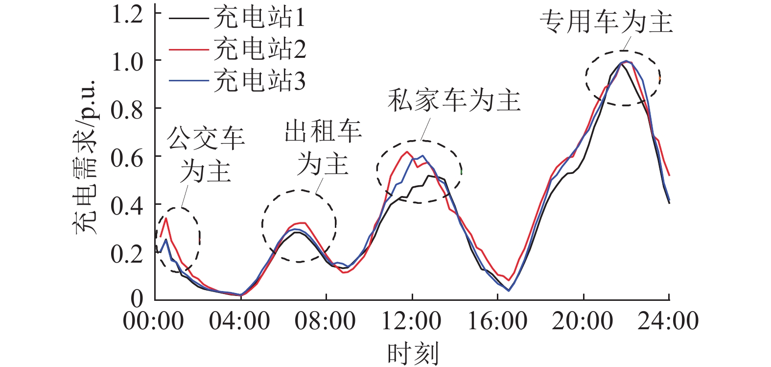 通过1.3节基于蒙特卡洛法的EV充电需求测算发现,一个额定功率为600 kW的EV充电站一日内最多可接纳250辆不同类型的EV充电,因此,文中算例以700辆不同类型的EV为研究对象,其中私家车、公交车、出租车和专用车的占比分别为85%、2%、5%和8%,其到达时间、初始电池SOC、电池容量、充电类型和充电周期等充电特征根据表1随机生成。假设所有EV每天随机到达充电站并开始充电,在充电过程中保持额定充电功率且忽略功率损耗,当电池SOC达到0.95时停止充电,得到的各充电站总需求曲线如图10所示。
