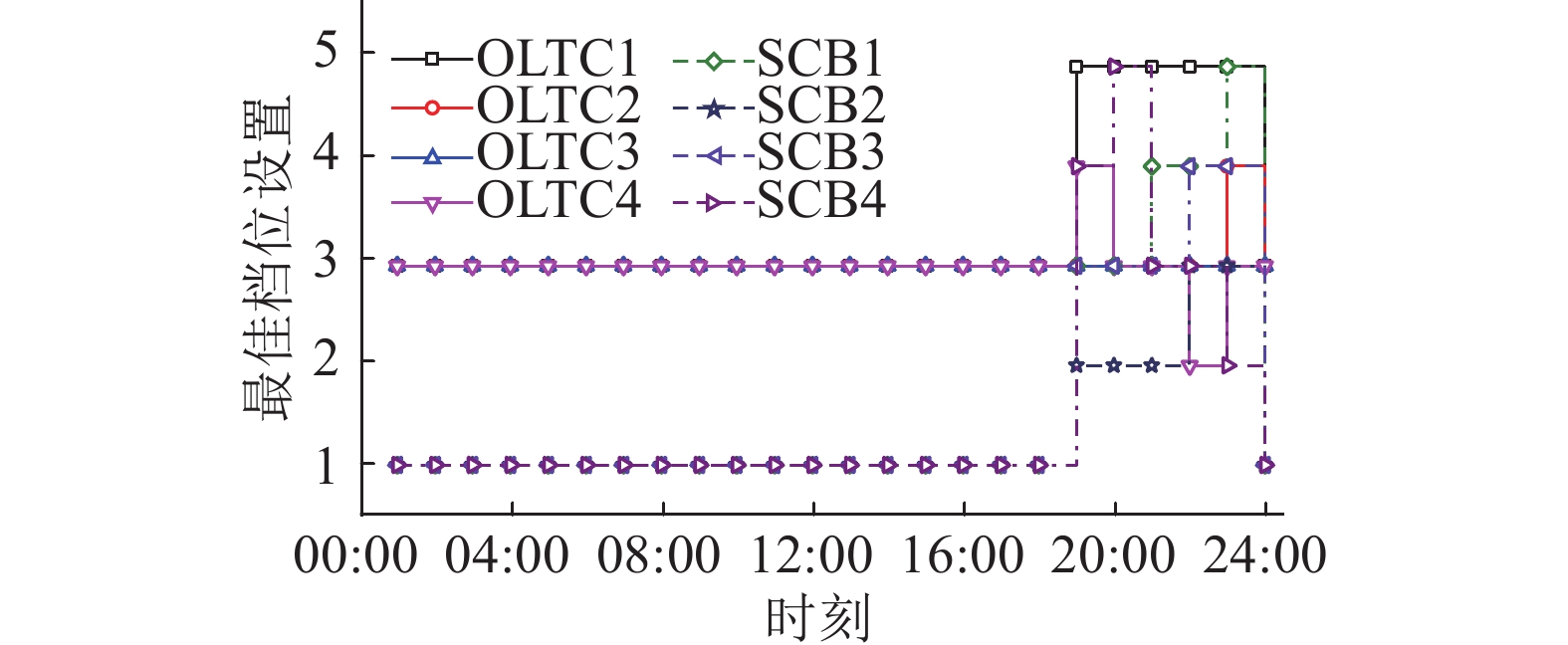 图 12 OLTC和SCB的日前最优运行曲线 Fig. 12 Optimal day-ahead operational curves for OLTCs and SCBs |