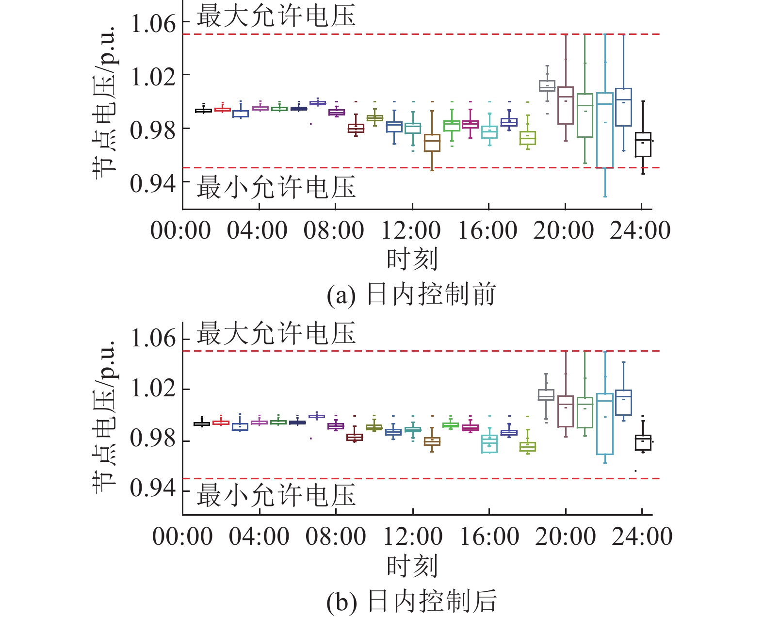 图 14 日内控制前、后节点电压分布箱型图 Fig. 14 Boxplot of node voltage distribution before and after intraday control |
