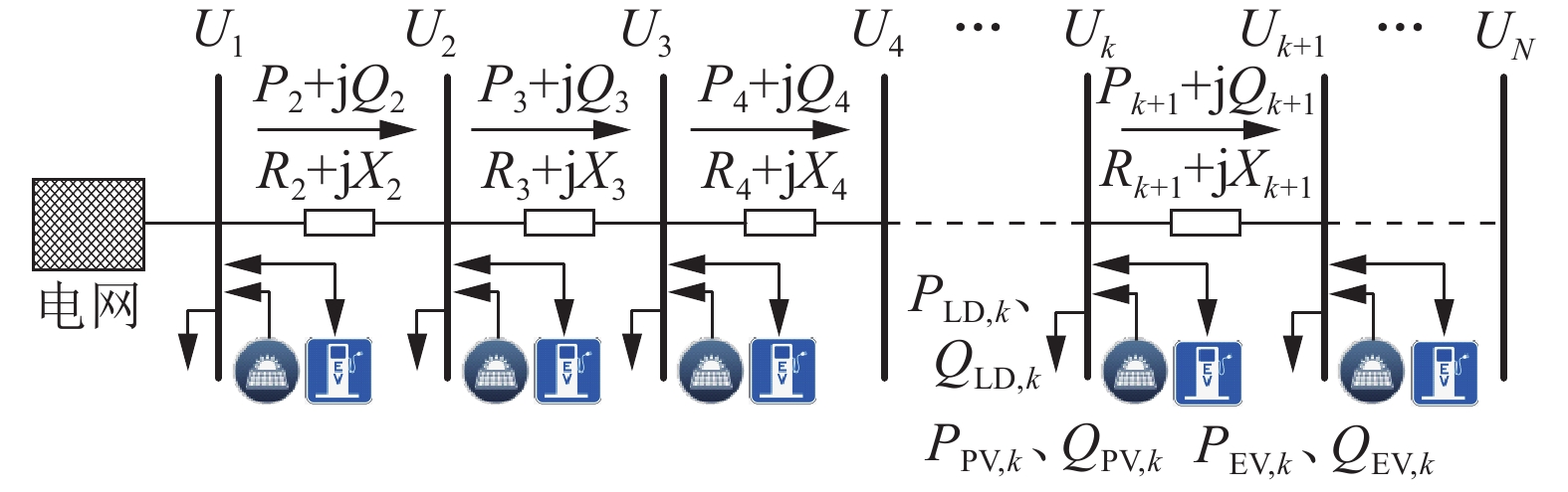 式中:Uk、Pk、Qk分别为节点k的电压、有功功率和无功功率;Rk、Xk分别为节点k−1和节点k间配电线路的阻抗和电抗;PLD,k、PEV,k、PPV,k分别为节点k所连负荷、EV和PV的有功功率;QLD,k、QEV,k、QPV,k分别为节点k所连负荷、EV和PV的无功功率;N为目标配电网所含的总节点数。