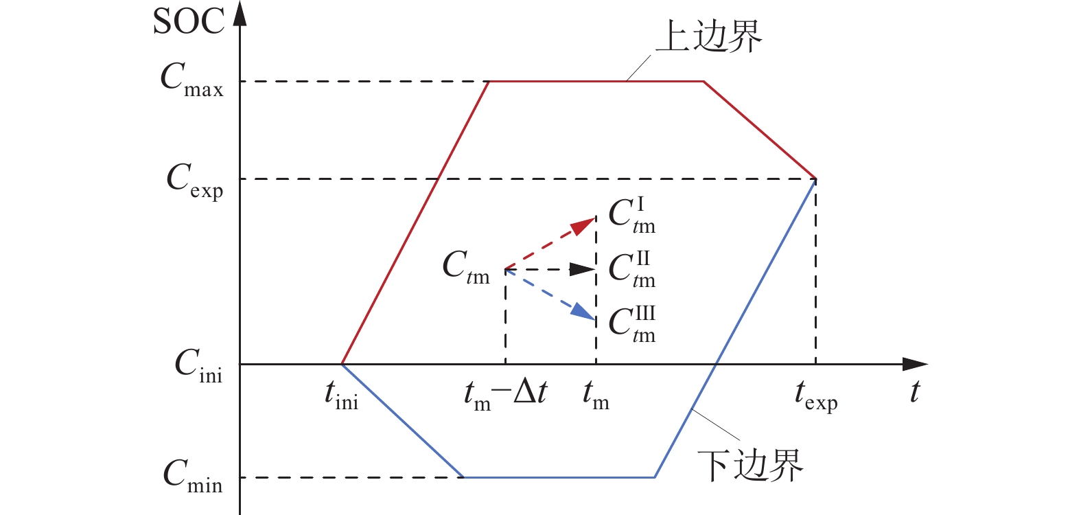 由图5可知,对于任意充电片段[tm−Δt,tm],EV具有3种不同的工作模式(充电、空闲和放电),使得电池SOC有所不同(对应图5中的