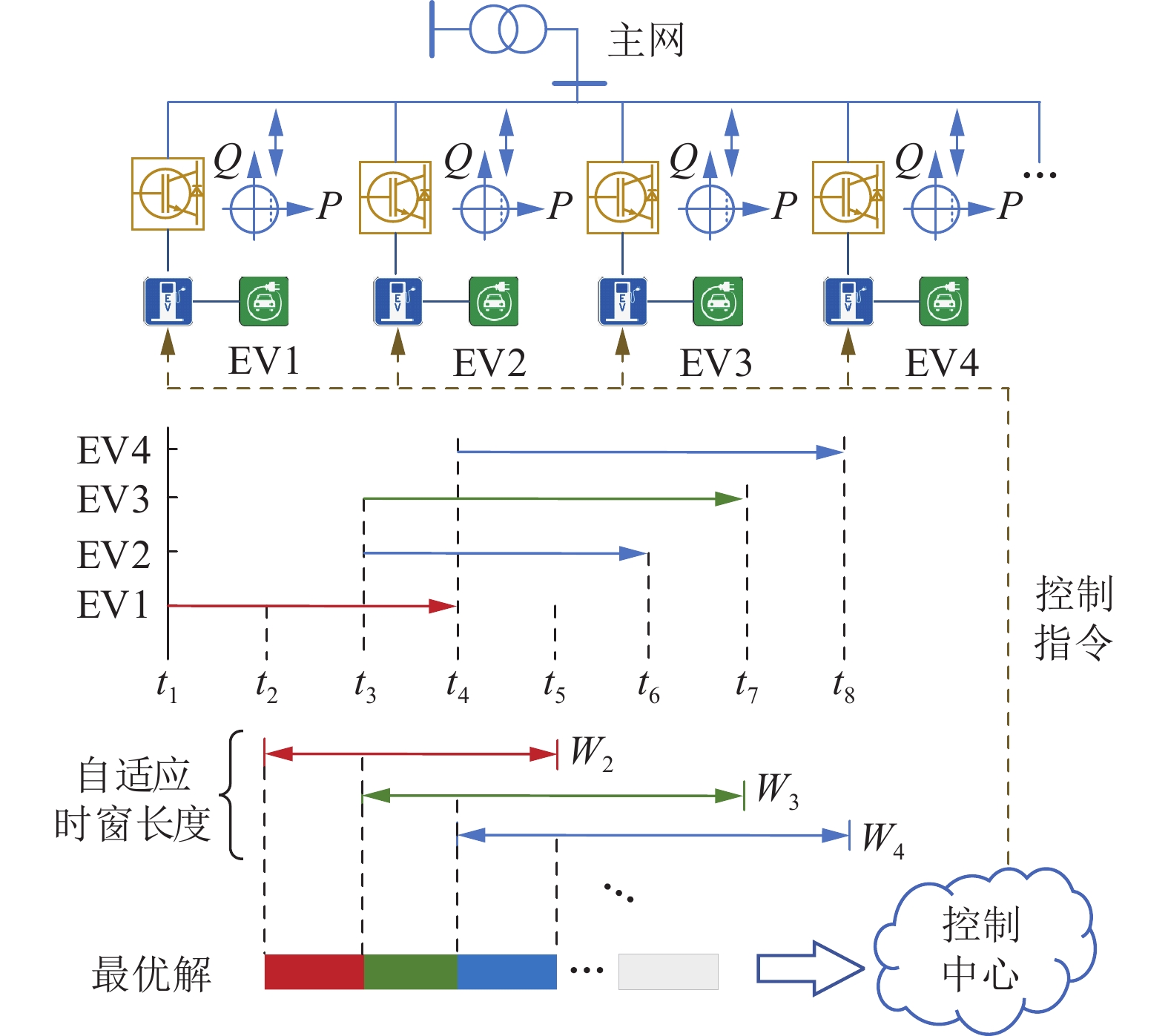 由于PV的无功调节范围只与其实时有功输出相关,对于优化时窗窗长无特殊要求;而由于EV任意时刻的无功调节范围受剩余充电时长、用户期望的电池SOC值影响,需要动态调整EV集群的无功优化时窗。因此,可采用具有自适应时窗的滚动优化方法来获取EV、PV任意时刻的最优无功配置。以图6为例说明,假设4辆EV在不同时刻接入各自充电桩充电且具有不同的充电时长,在t2时刻只有EV1接入充电桩充电,而在t4时刻EV1—EV4均接入充电桩充电,根据任意时刻下接入充电桩的EV数量与其剩余充电时长,可计算当前时刻的滚动优化时窗窗长,如式(26)所示。