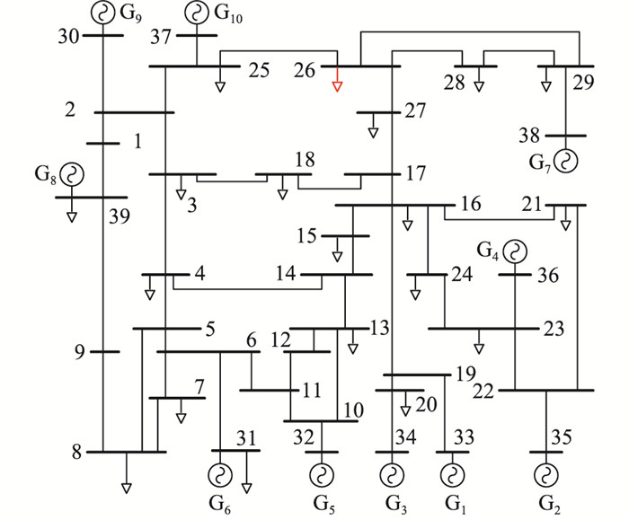 3.1 仿真数据算例使用基于Matlab的电力系统时域仿真软件PSAT得到电力系统类噪声工况的数据。仿真系统为标准的IEEE 10机39节点系统,系统结构如图 2所示,其中G1—G10为发电机[24-25]。对26号节点的有功功率施加标准差为0.05倍均值的典型类噪声扰动,该类噪声信号为电网中实测有功功率信号。
