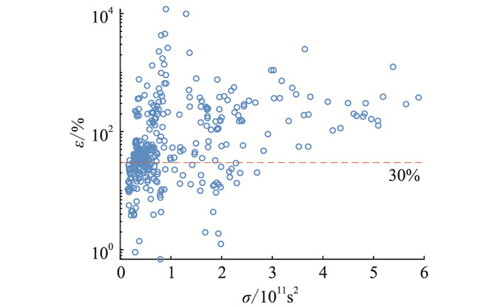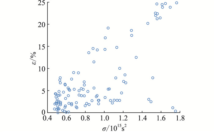 可见,估计的参考系统惯量与设定值较为接近,参考系统能够近似真实系统。之后对各机组后280 s的数据集各数据窗进行惯量辨识。统计每个数据窗的辨识误差ε,并进行先验方差σ的估计。G5的先验方差和辨识误差关系如图 3所示。可见先验方差和辨识误差有明显正相关关系,先验方差σ较小的数据组,辨识误差ε一般也较小。对G1,G5,G6,G9,筛选出先验方差较低的50%数据窗,得到新的数据集。仿真数据辨识误差较小,因此取有效误差门限εTH为5%。