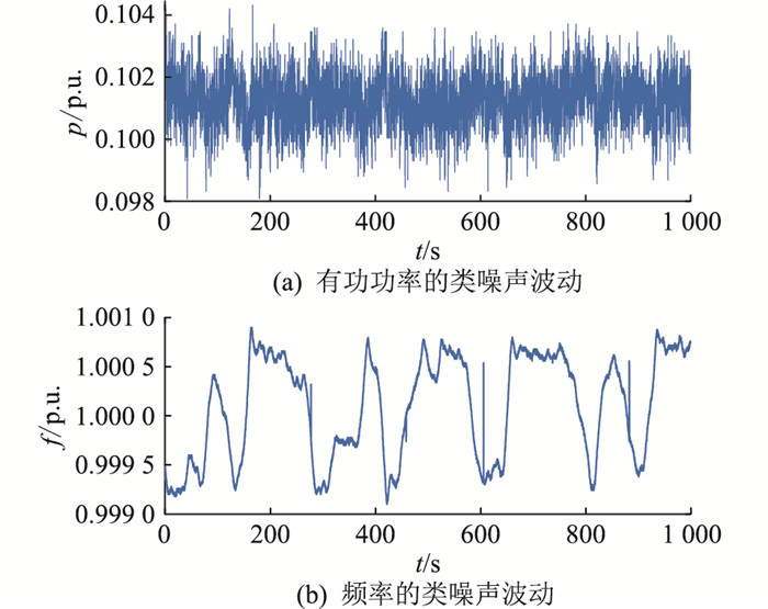 1号发电机典型的有功功率、频率类噪声信号波形如图 5所示,两图选取时间段相同,展示了功率和频率同步变化。可以观察到频率信号的毛刺缺陷。为解决这一缺陷,数据预处理时在标幺化、去均值前增加零相移低通滤波操作[20]。由于信号能量主要分布在较低的频段,滤波操作对频率信号有效成分的影响较弱,因此能有效地滤除波形中的毛刺与高频噪声。文中处理实测数据时,零相移低通滤波器的截止频率选为0.5 Hz。