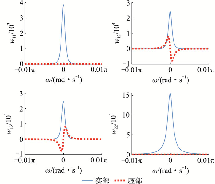 加权矩阵W(ω)是一个2×2的复矩阵,记其第i行第j列的元素为wij(ω)。图 7为W(ω)矩阵各个元素的虚实部值与ω的关系。