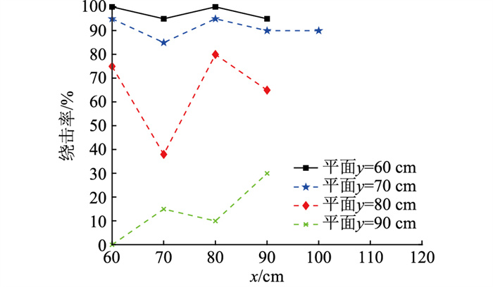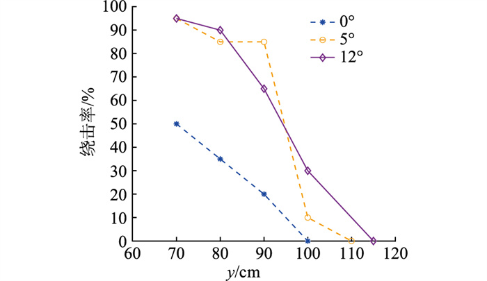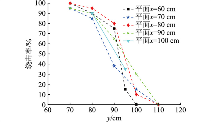 为了更直观地研究平面各点的绕击率分布,将试验结果按照区间划分并将各个区间的绕击变化趋势合并对比,得到绕击率随高度变化的趋势,如图 8、图 9所示。