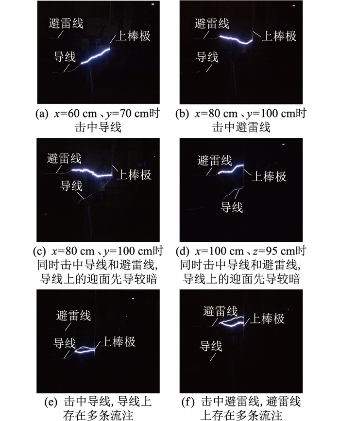 施加负极性操作冲击电压时,试验间隙内放电通道外形与自然雷电先导通道相似,有明显的随机性和曲折性,间隙的击穿主要为上棒电极和地面结构的流注贯穿过程。由图 12(c)、(d)可以推断,在下行先导发展过程中,导线和避雷线可能都产生了迎面流注,下行先导选择性地击中导线和避雷线,可以认为导线和避雷线并非相互独立的2个结构,雷电的先导最终附着结果是由传输线、避雷线和大地共同竞争的结果决定。