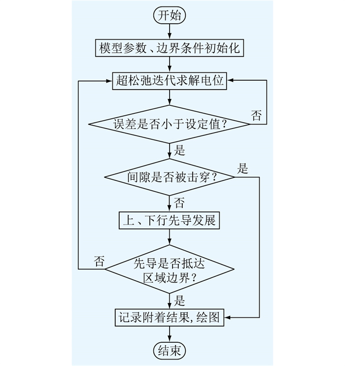式中:Eb为下行先导发展的临界背景场强;Ei→j为i、j两点之间的平均场强;Nd、Nc分别为已发展点和待发展点的数量;η为发展指数,表征先导发展方向对电场强度的依赖程度,同时影响放电通道的分形维数。每产生一个新的先导发展点,都要重新计算空间电位矩阵。当误差小于设定值时,判断间隙是否发生击穿,当上下行先导头部距离达到临界击距Lg时,则认为间隙被击穿。流程如图 14所示。