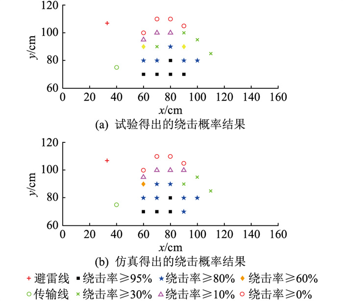 2.3 仿真与试验对比分析 2.3.1 绕击率空间分布在前文试验中,绕击率空间分布与仿真结果对比如图 15所示,可见仿真结果中绕击空间基本呈现倒抛物线型,高度与传输线接近且水平距离靠近传输线的区域绕击率较高;离传输线越远,绕击率相应减小。绕击率为0%~10%的绕击空间分布基本为倒U型,符合电气几何模型。