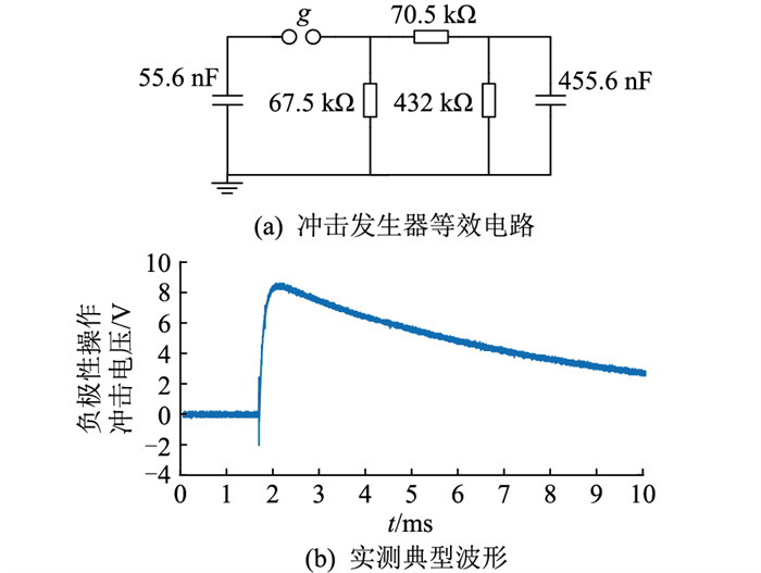 1.2.4 试验电压波形选择近距离的负地闪电场分布观测结果显示,自然雷电在近地面引起电场显著变化的作用时间与操作冲击波波前时间相似,同时产生的电场分布与操作波产生电场较为接近,参考GJB 3567-99以及前学者进行雷电模拟采用的电压波形[26],160 μs的波前时间能有效模拟下行先导逼近时空间电场的分布。因此文中试验模拟雷电的冲击电压选160/2 500 μs的负极性操作冲击电压。此时,冲击发生器等效电路如图 6(a)所示,实测典型波形如图 6(b)所示,波头时间Tf=192 μs,波尾时间Tt=2 105 μs,波头、波尾误差均在±20%范围之内,效率稳定在77.68%左右,可满足文中试验要求。